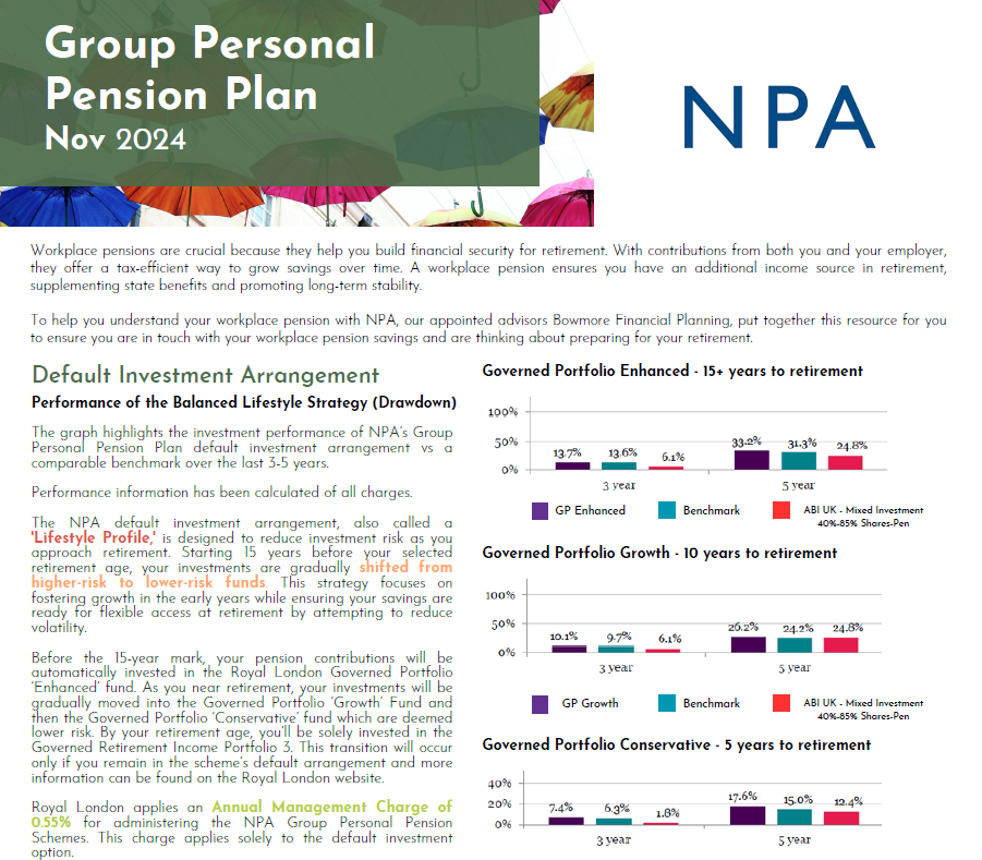Not only does Royal London empower you to manage your pension, but they also provide a diverse selection of investment options. With access to over 180 funds, you can select investments that align with your risk tolerance and financial goals. This allows you to create a well-diversified portfolio that has the potential to generate attractive returns over the long term. However, please remember your investments can go up as well as down. For those who do not wish to personally select their investments, NPA have selected a default investment option where your pension contributions are automatically invested each month in the chosen arrangement. You can find out more on this default investment arrangement by reading the newsletter provided below.